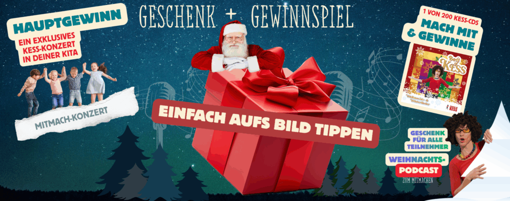 Geschenkt: Ein KESS-Konzert in deiner Kita! Für die Weihnachtszeit 2025 haben wir uns etwas ganz besonderes überlegt. Hier geht’s zum Geschenk und zum Gewinnspiel.